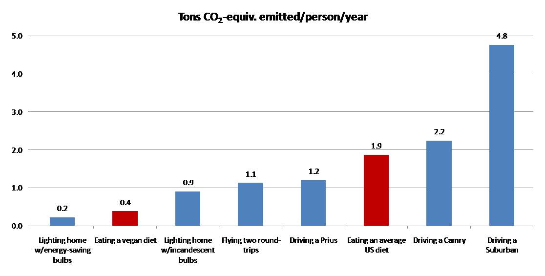 The greenhouse gas savings from replacing the average US diet with a vegan diet are pretty significant, but it’s even better to leave the Suburban in the garage.