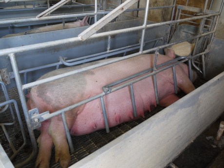 For the uninitiated, gestation crates are metal cages in which pregnant sows live while they await the birth of their litters. Since it’s to the farmer’s advantage to breed his sows as often as possible, the sows end up spending the majority of their mature lives in these cages, which are typically not large enough for them to turn around, and sometimes don’t even let them lie down without difficulty. Some gestation crates, however, are big enough for sows to recline and turn around; here is a picture of one from Fischer Family Farms in Waseca, Minnesota that allows the farmer to pull the sidebars down so that the sows can turn around.